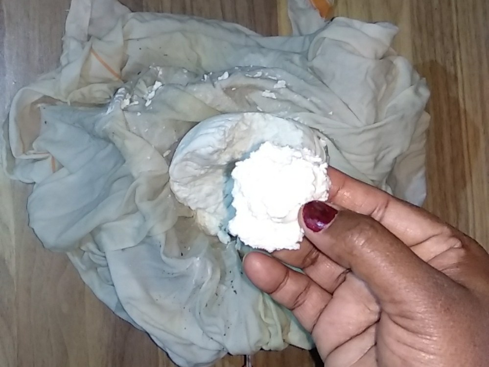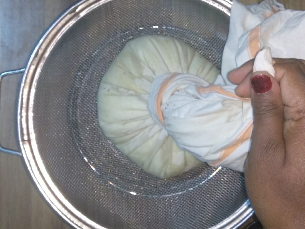 • Tie the knot to the muslin cloth and hand the cloth so that excess water drains out of the curd.