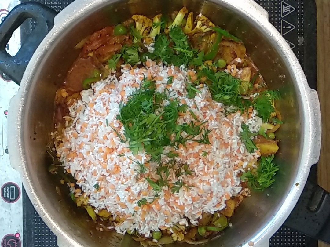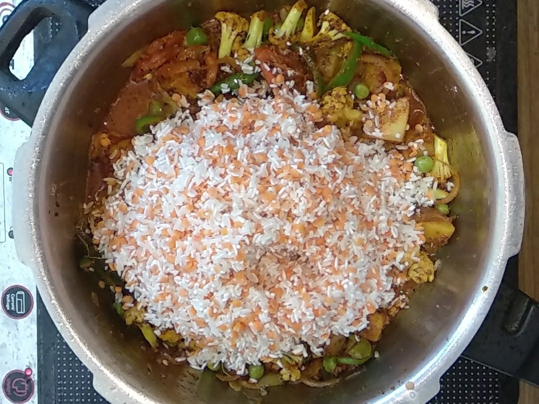 • Add washed rice and masoor dal to the mixture.
