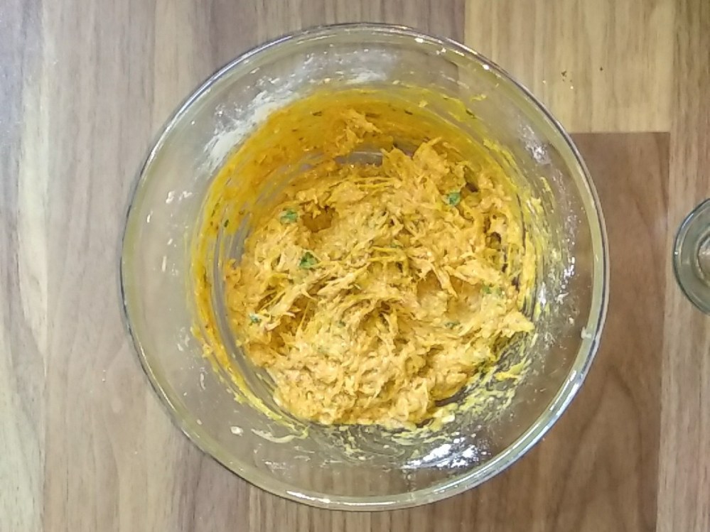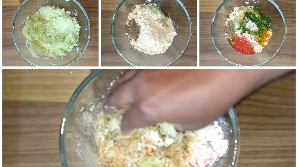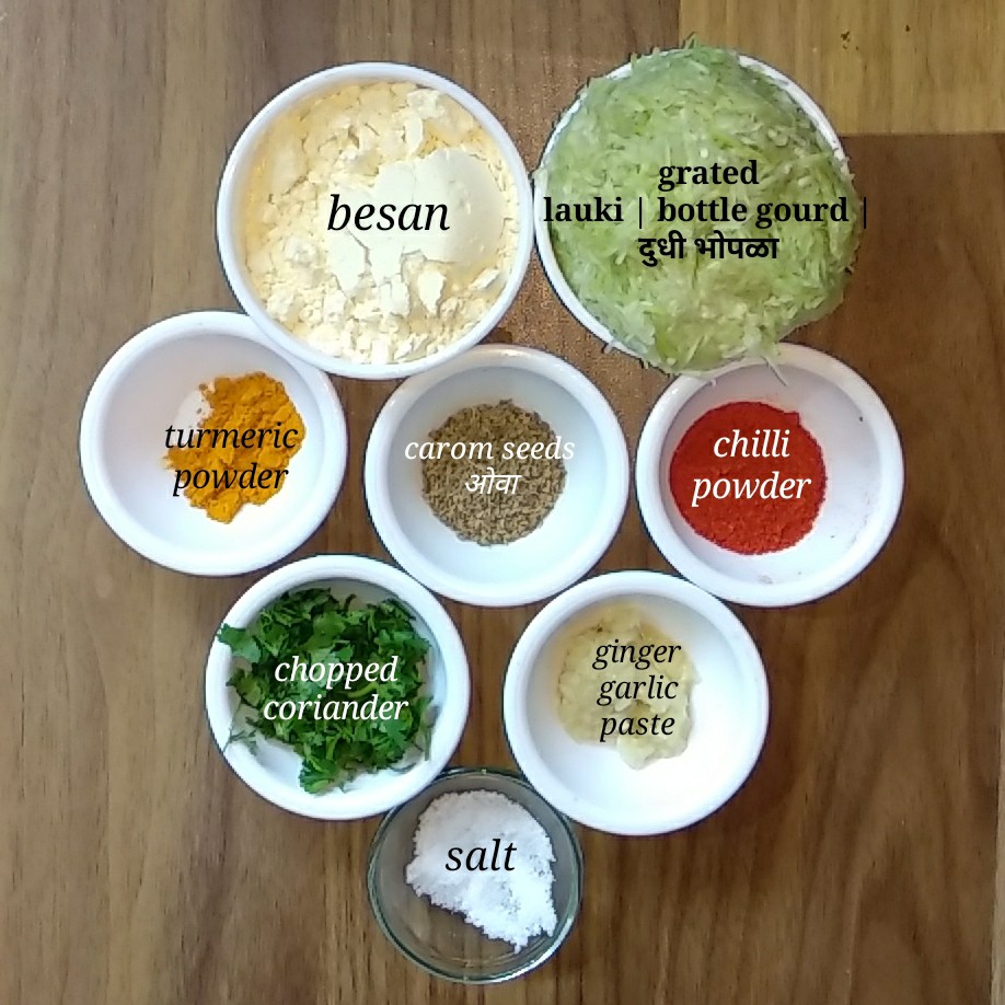 - In a bowl add the grated doodhi,besan,chilli powder,turmeric,carom seeds,ginger-garlic paste, chopped coriander and salt as per your taste.