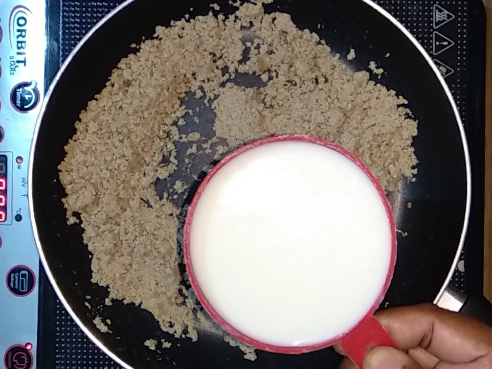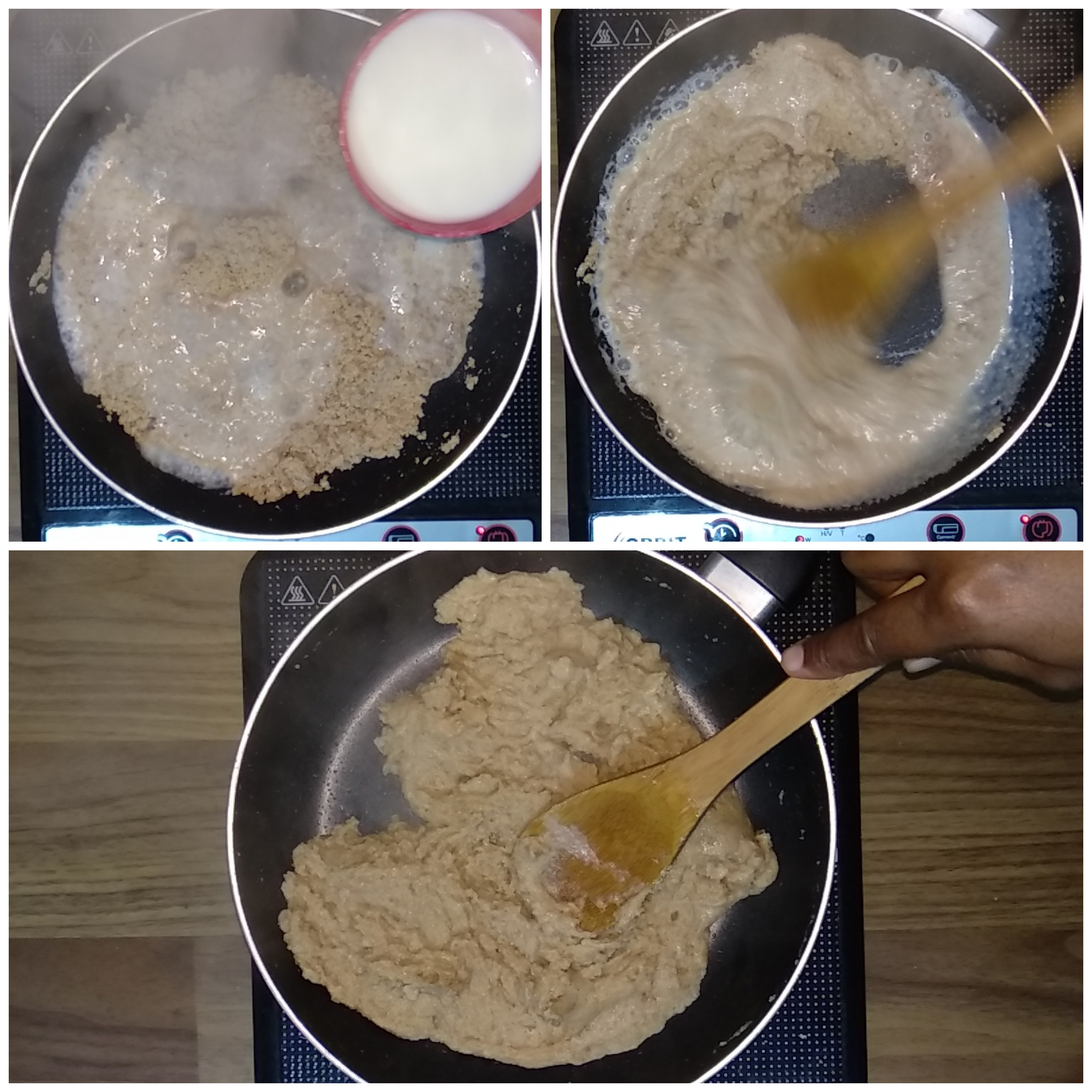 - Now add the hot milk slowly to the roasted rajgira flour.