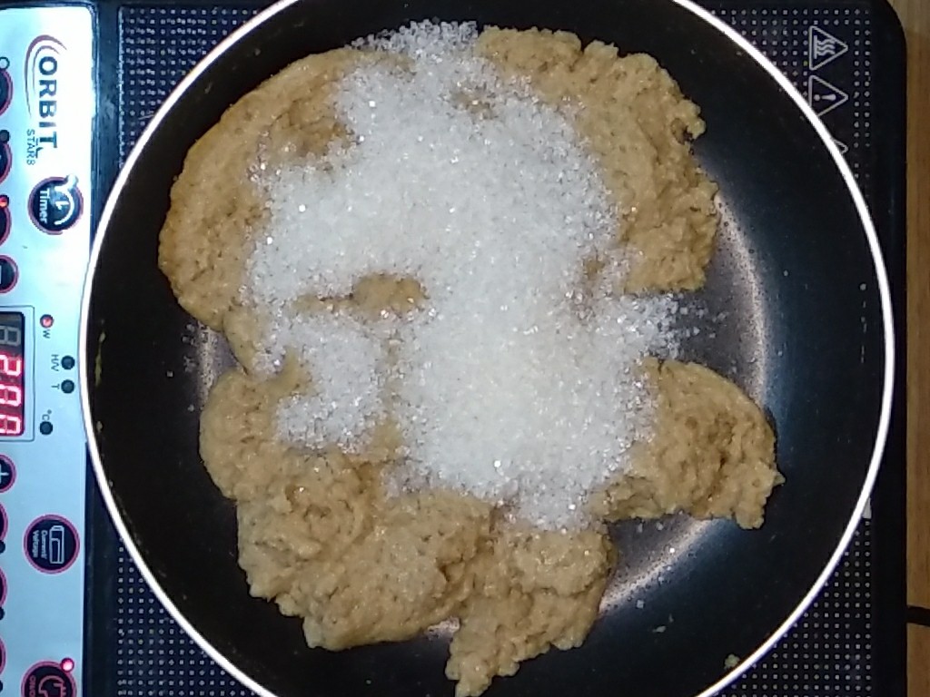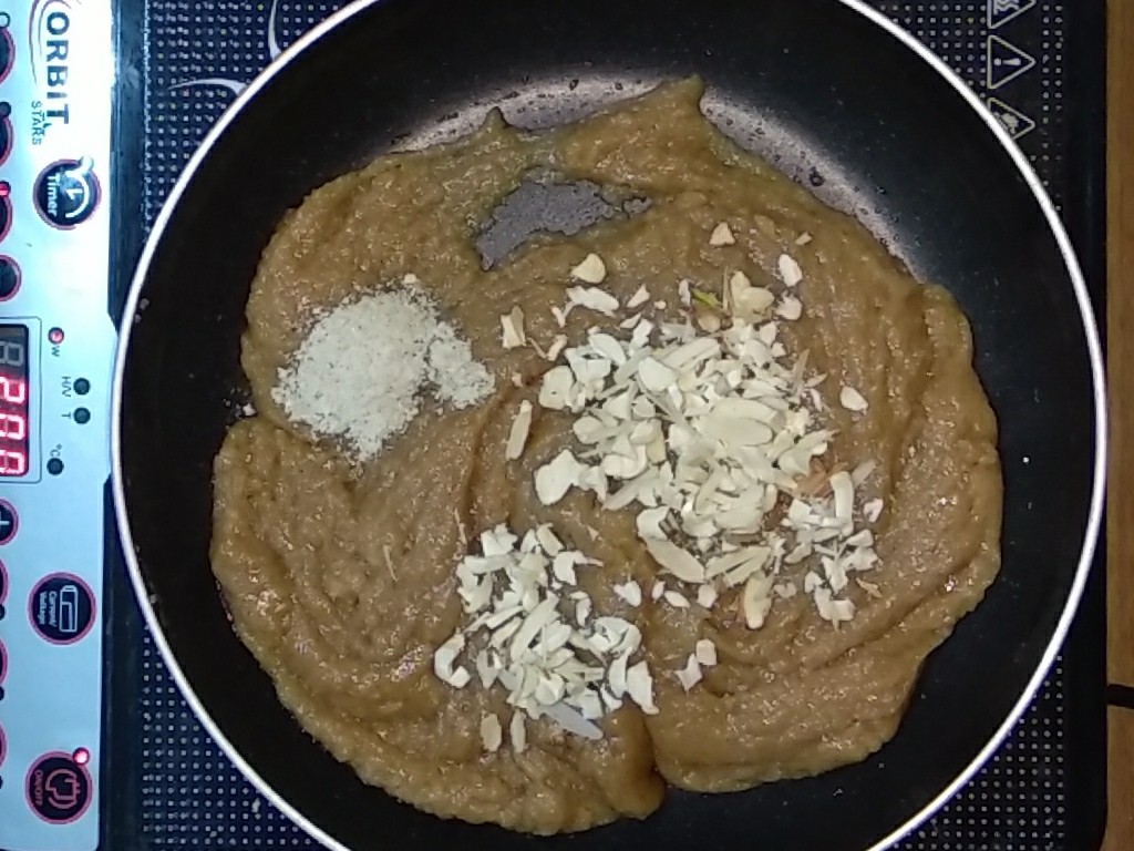 - When the sugar completely melts add the cardamom powder and the dry fruits.