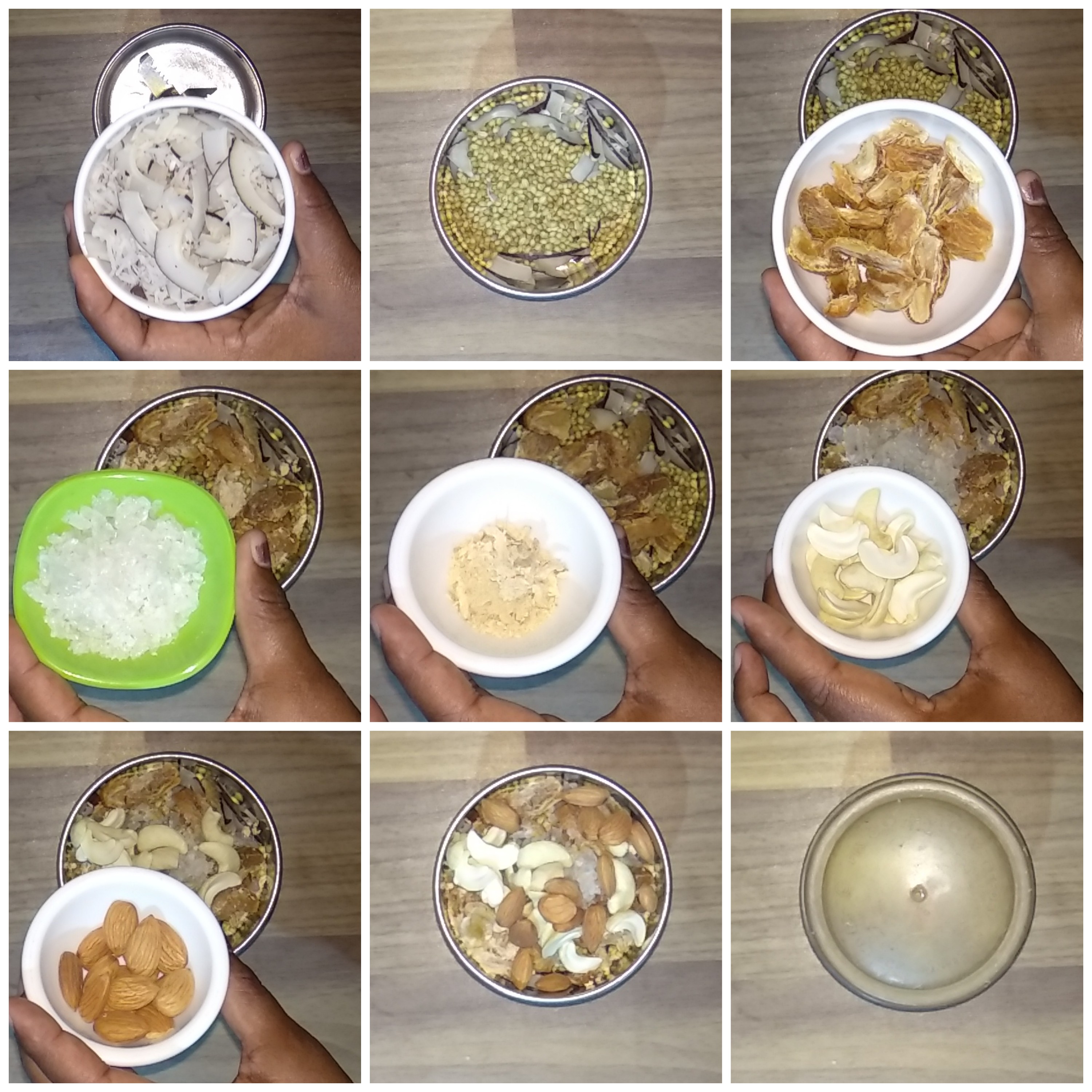 • Now in a mixer jar add dry coconut slices,roasted coriander seeds,dry dates,sunth powder,rock sugar and dry fruits.