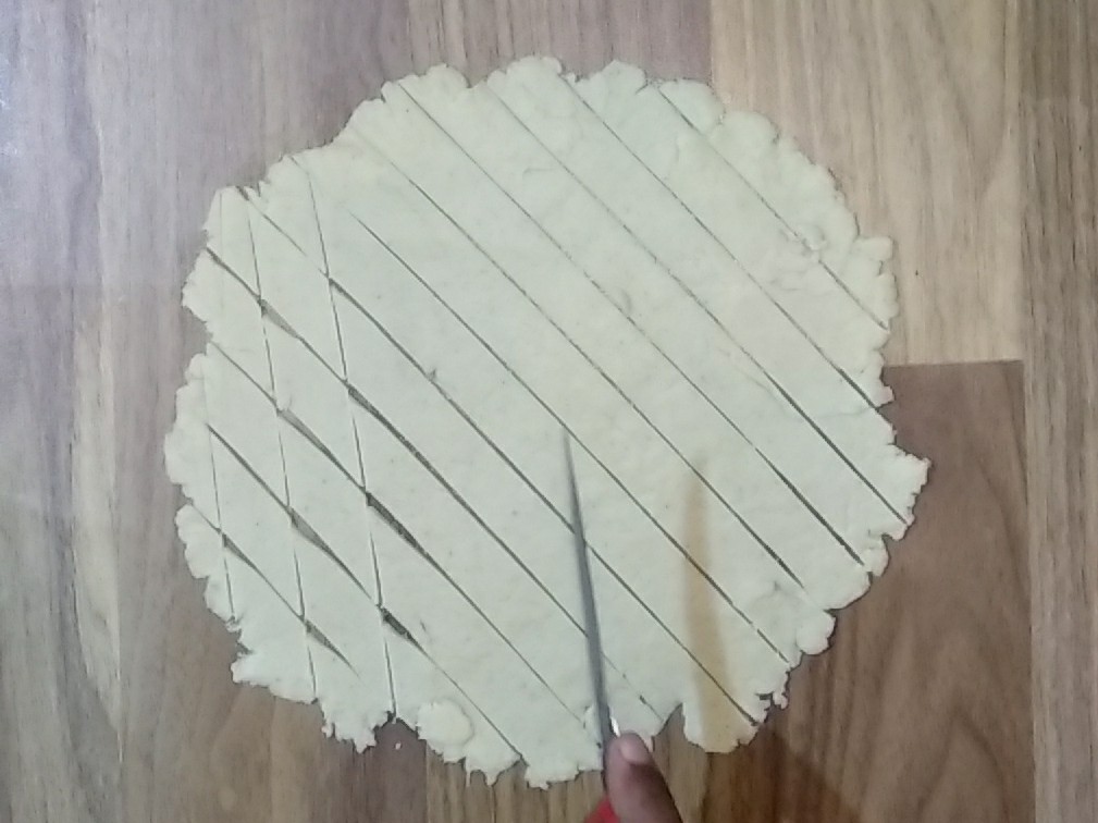 - Cut the rolled chapati in diamond shape with help of cutter or knife.