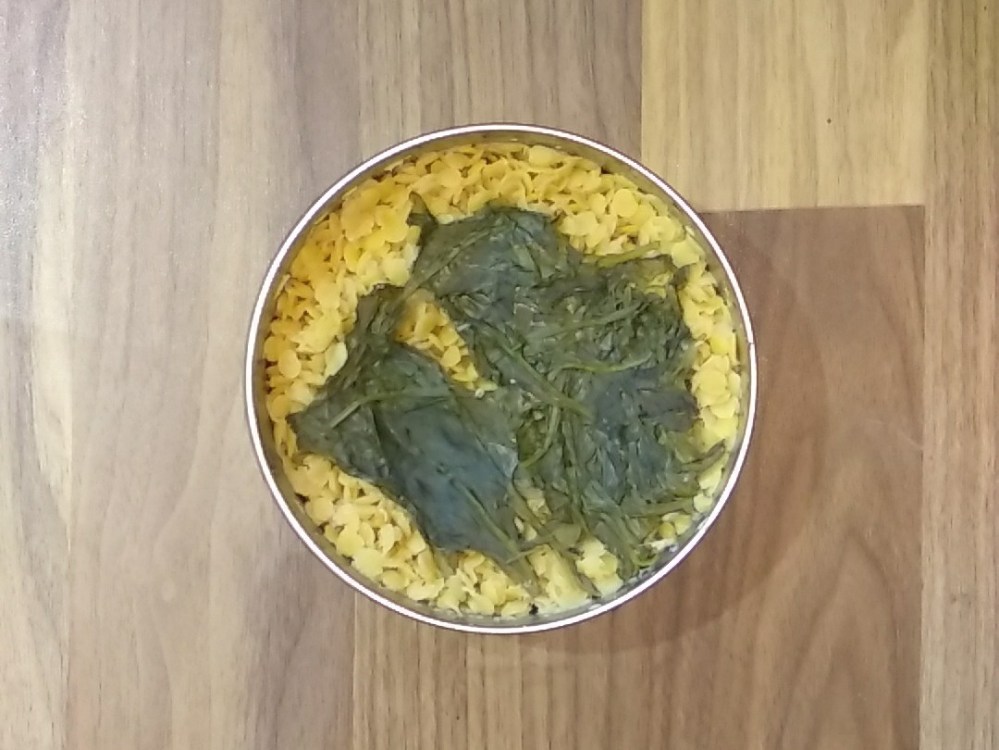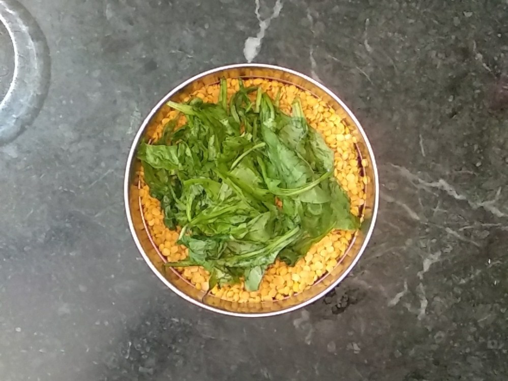 - Pressure cook both dal and palak in a pressure cooker to 3-4 whistles or till dal gets nicely cooked.