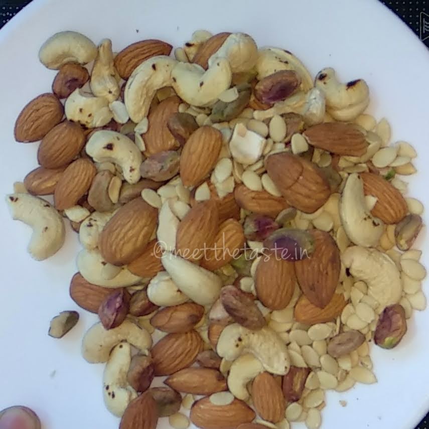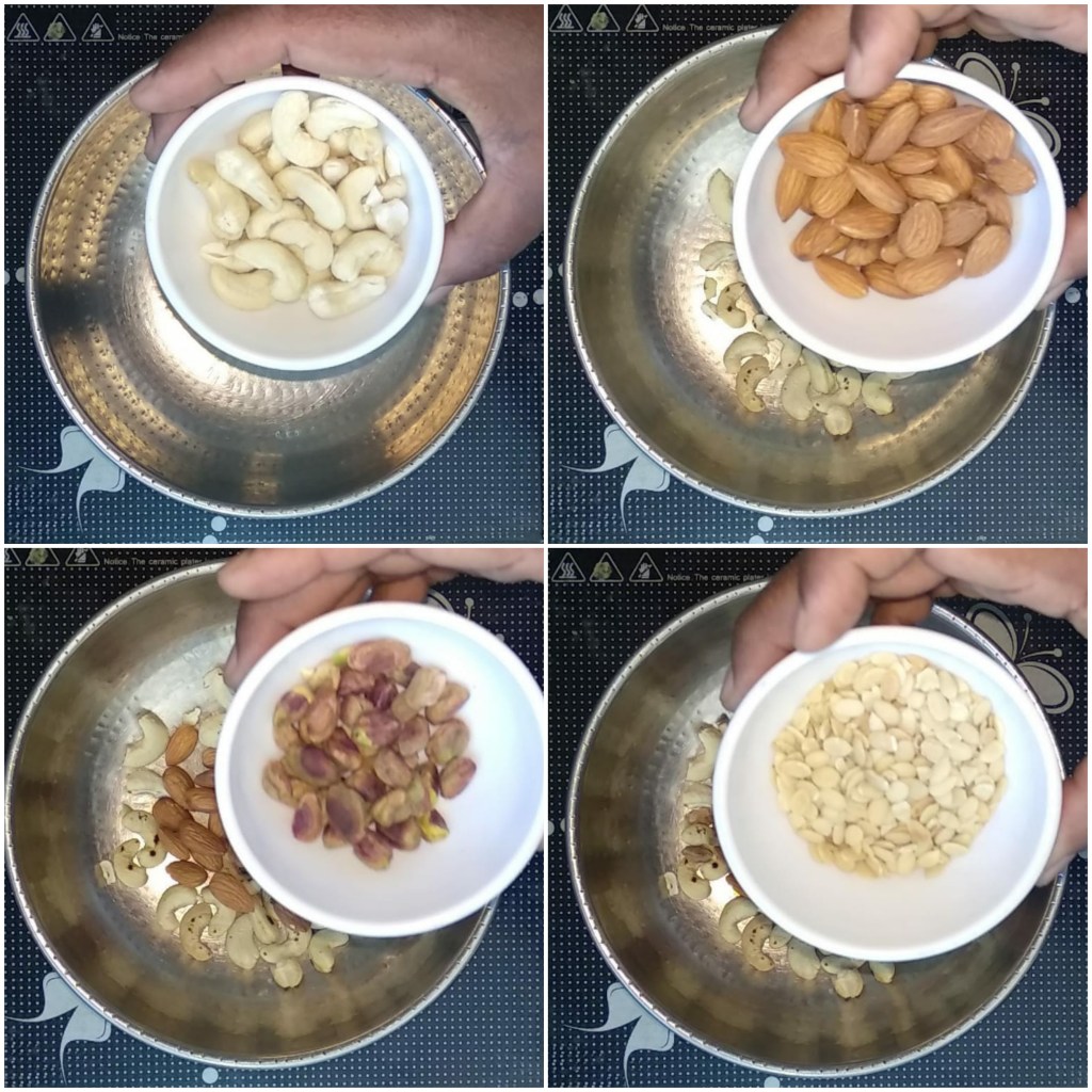 - Dry roast cashew nuts,almonds,pistachios,melon seeds on medium flame just to remove the rawness.