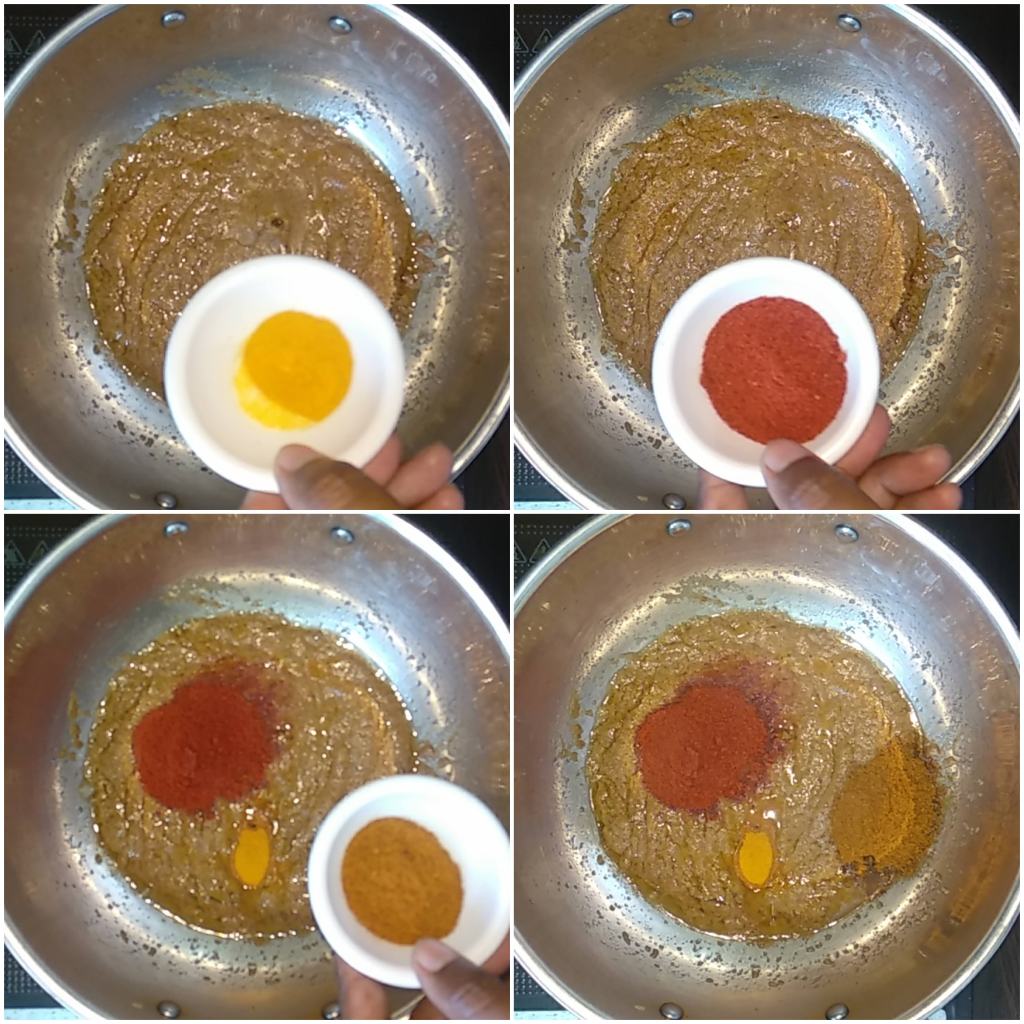 • Add red chilli powder,garam masala and turmeric powder and mix well.