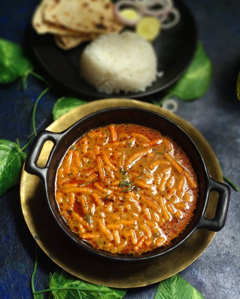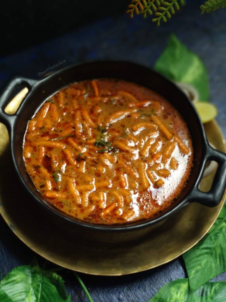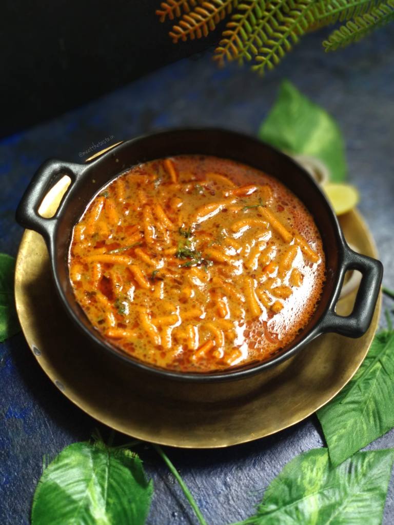 Keep the curry ready at the time of serving the sev or else it will get soft if soaked for long time in curry.