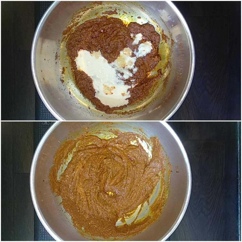 • Now add 3-4 tbsp of fresh cream or malai to the masala mix.Addition of cream gives a smooth texture and richness to the curry.
