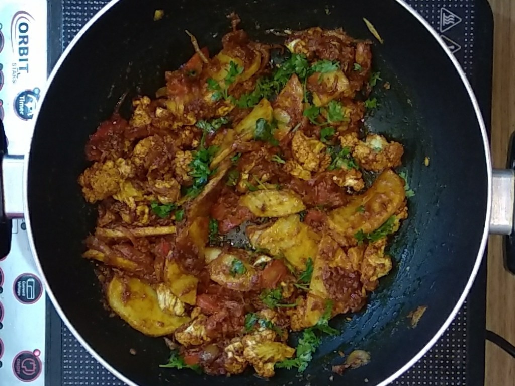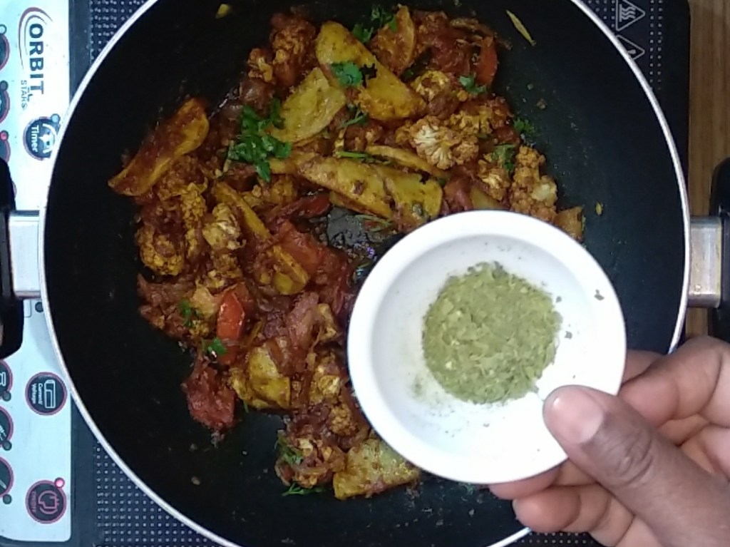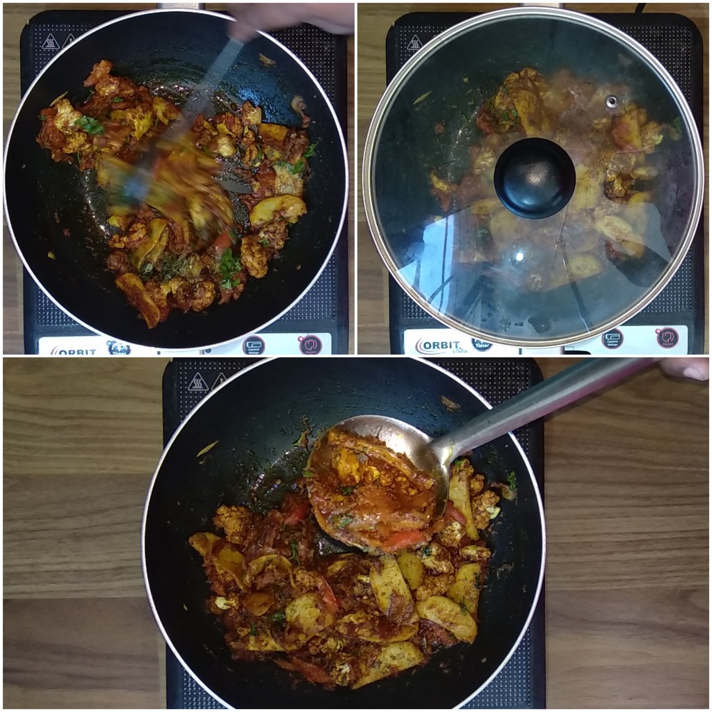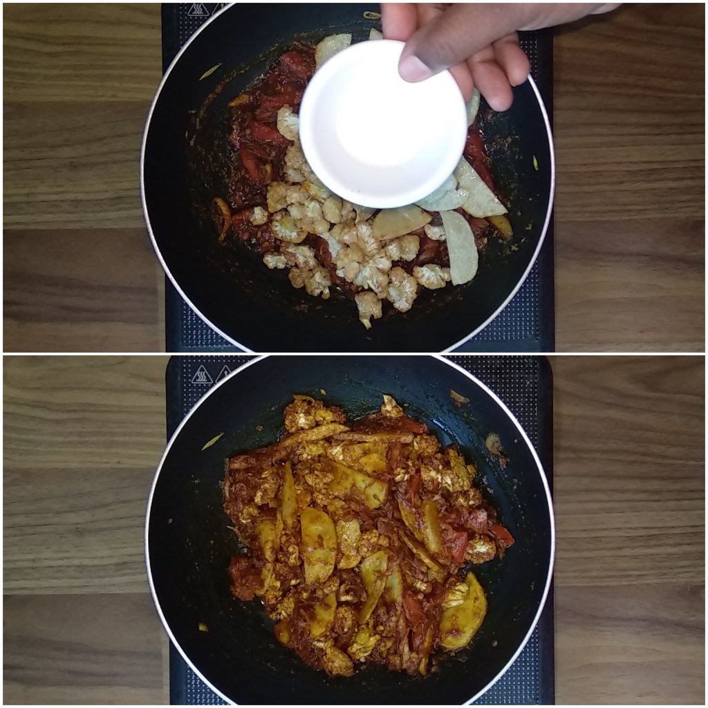- Add the fried cauliflower florets and potatoes and give a nice mix.