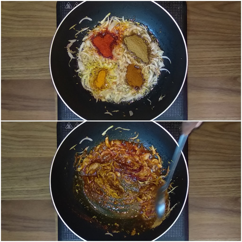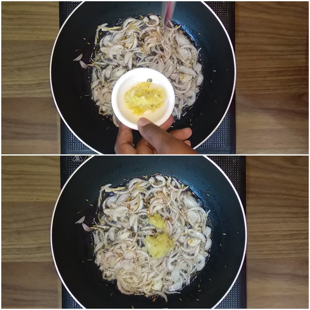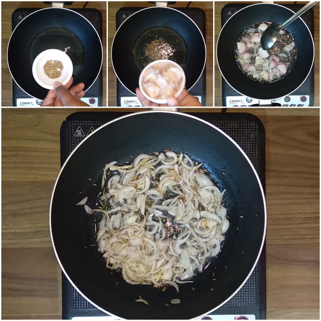 - Add the cumin seeds and once they start cracking add the sliced onions.