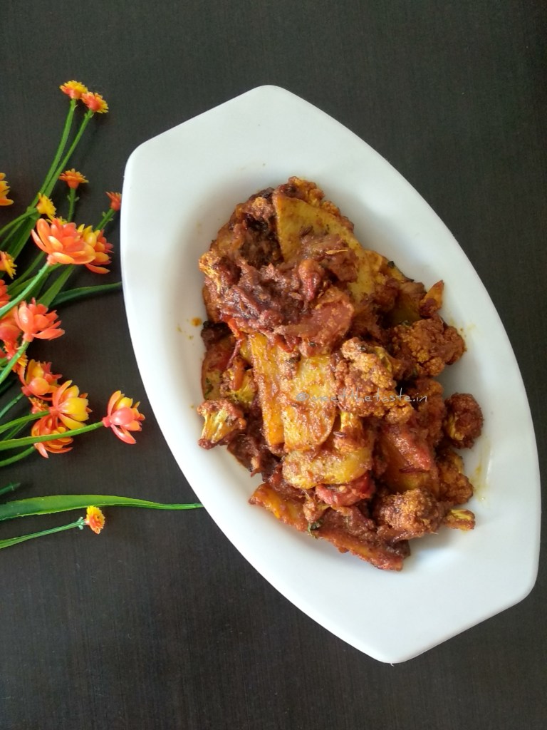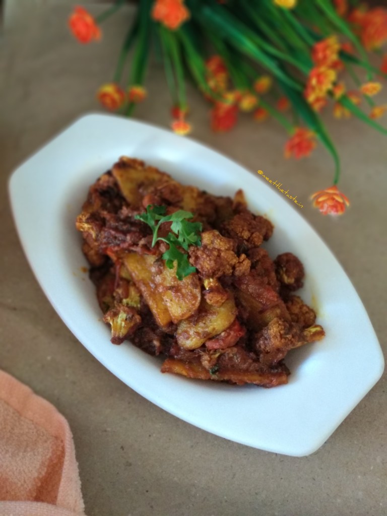 Here the dhaba style dry aloo gobi is made by frying the potatoes aka aloo and gobi aka cauliflower in oil and then added to a simple but flavourful onion tomato masala.It tastes awesome with roti or chapatti.