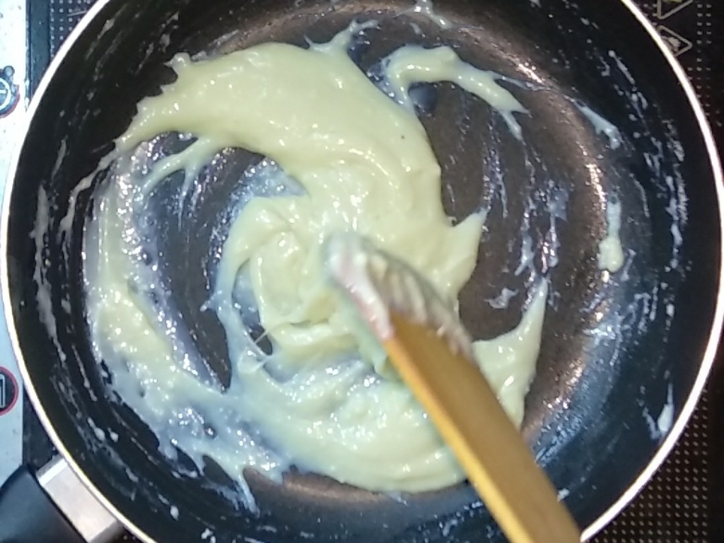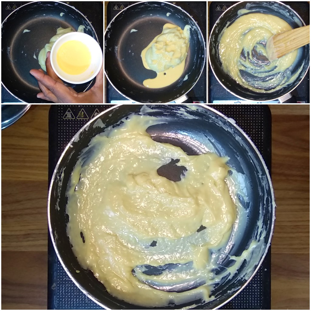 - Cook till the mixture comes together and starts leaving the sides of pan.