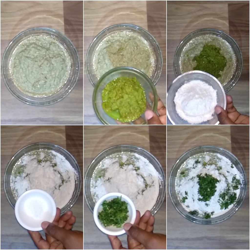 - Next add the rice flour,chilli-garlic paste,salt and chopped coriander.