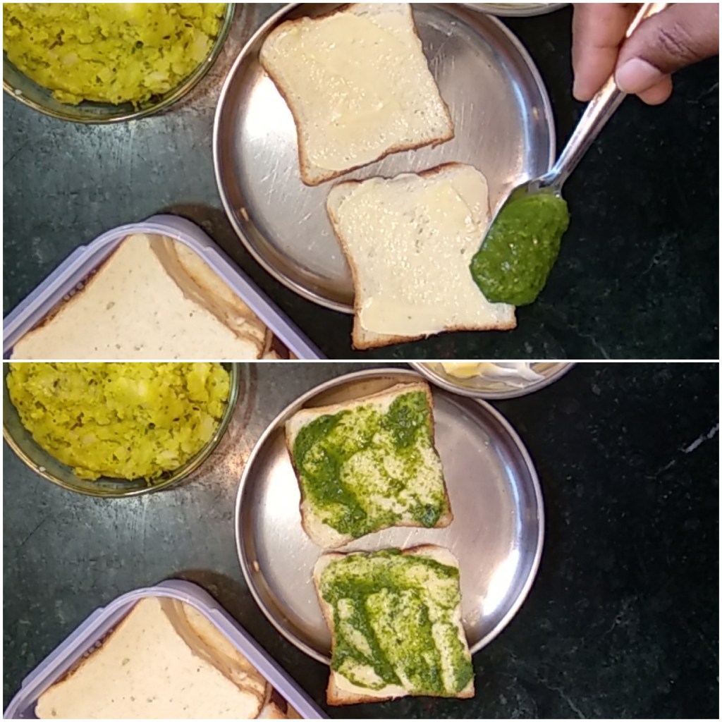 - Then the other bread slice that also is buttered and layered with green chutney is kept over this slice.