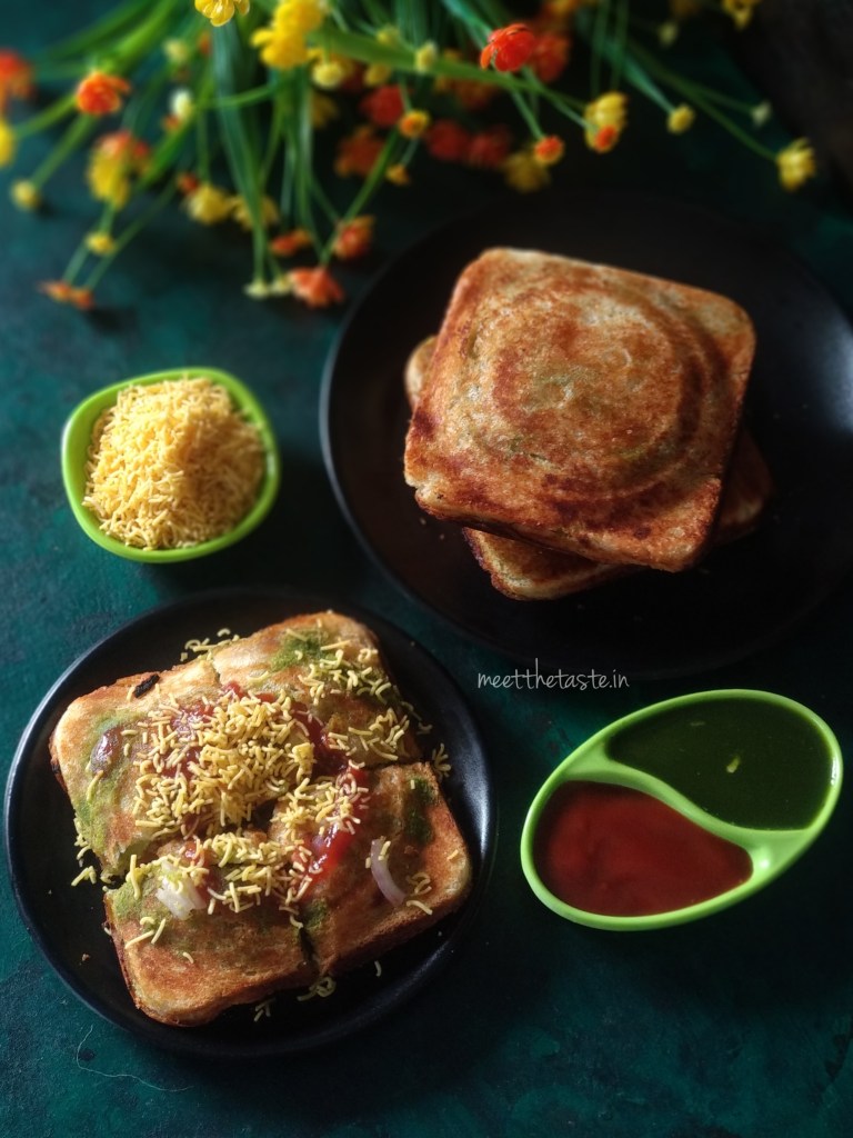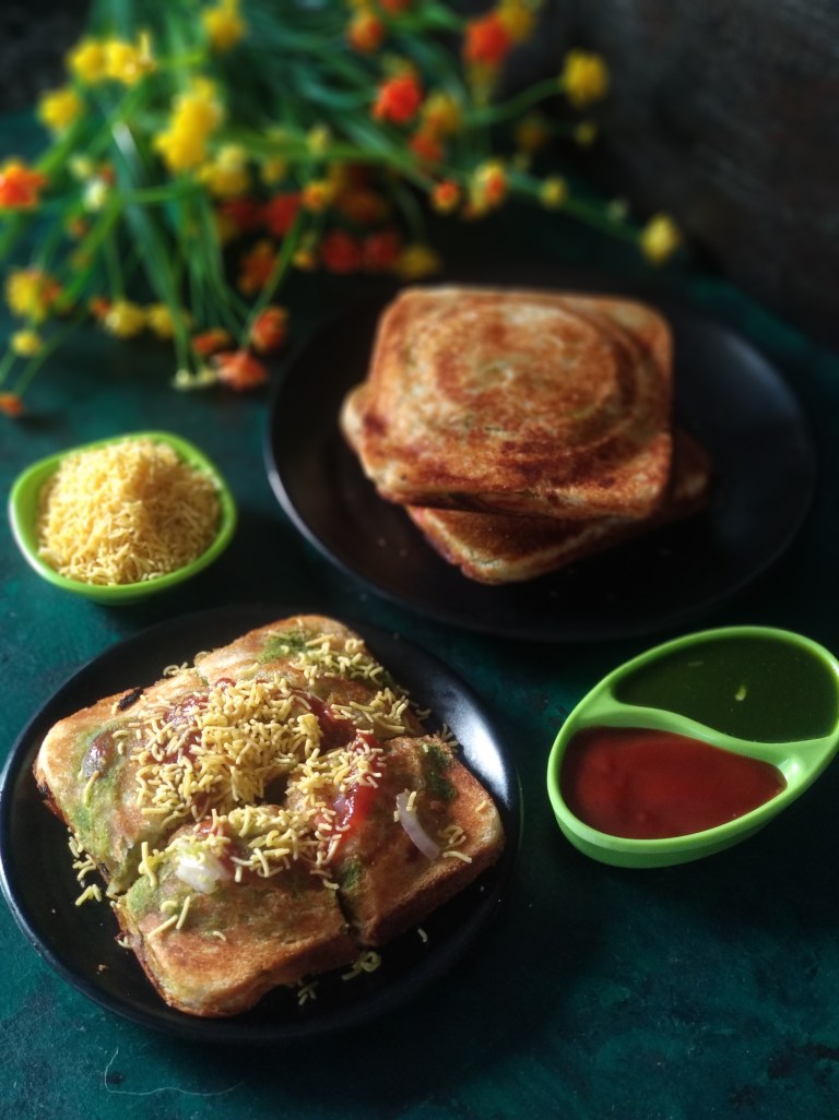 Bombay Toast is a pressed sandwich layered with green chutney,butter,tomato ketchup,spicy potato filling,fresh sliced vege’s.It is then toasted or grilled in a sandwich toaster.