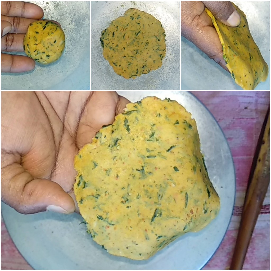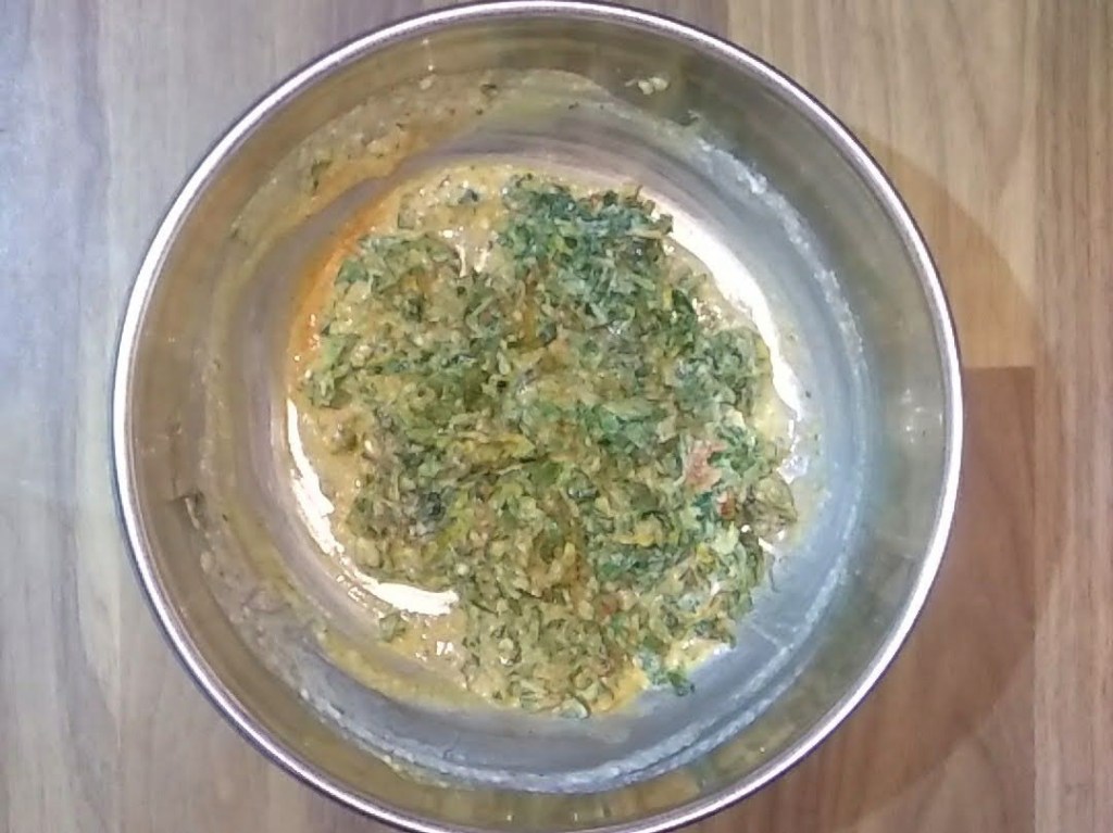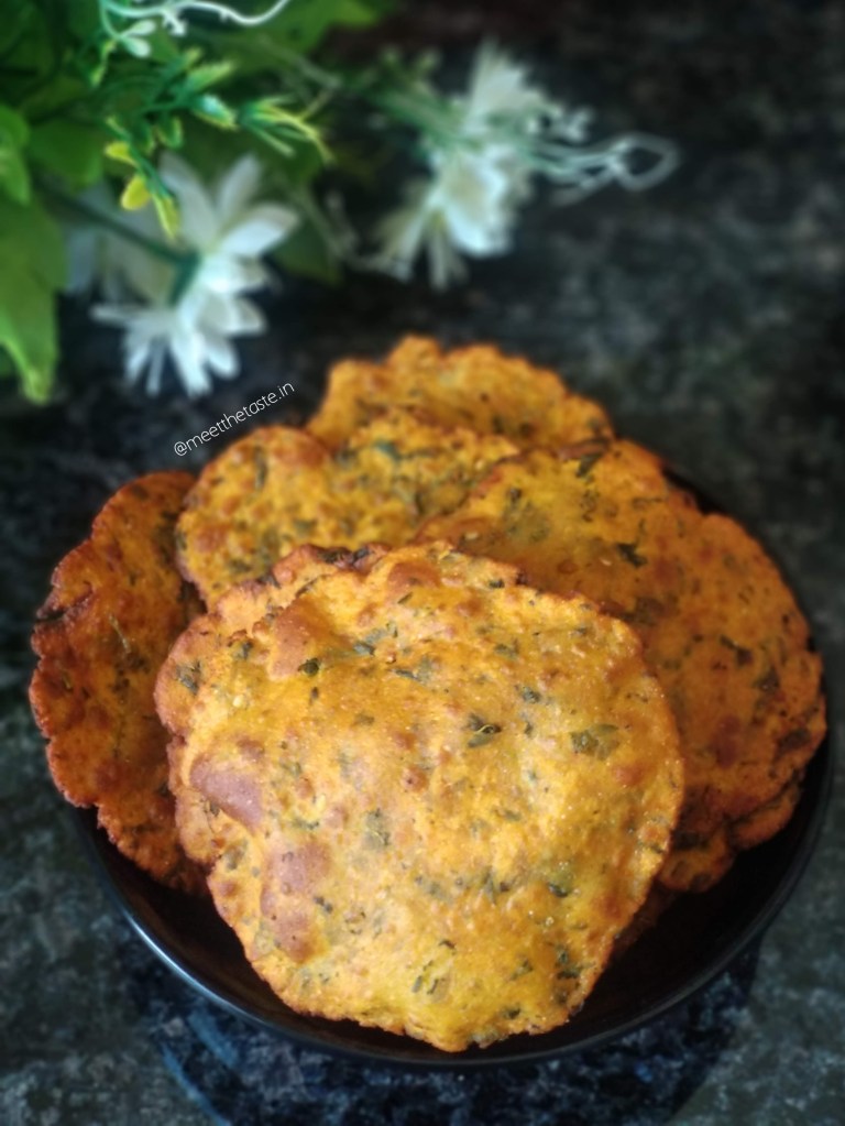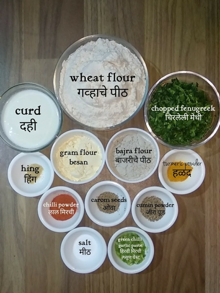 It is prepared by mixing freshly chopped fenugreek leaves with 3-4 types of flours like wheat flour,bajra flour,besan…..These are then spiced with jeera,ajjwain,chilli powder and turmeric.The good thing about this recipe is that it includes different types of flours that makes it more healthy.